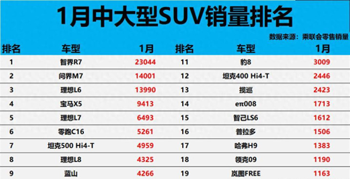 中大型SUV,曾经是豪华和身份的象征,如今却逐渐走进寻常百姓家。从燃油到新能源,从合资到自主,中大型SUV市场正经历一场前所未有的变革。2025年1月,奇瑞智界R7的夺冠,无疑给这潭本来就波澜不断的湖水,扔下了一块巨石。它引发的涟漪,远不止于销量榜单的排名变化,更是对整个市场格局的重新洗牌。